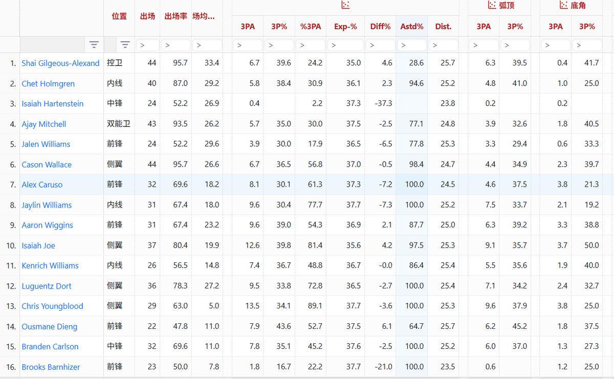 雷霆全队16人除了亚历山大三分受助攻率不足30%外,其余人都在60%以上,几位首发受助攻率更是飙到77%以上。从这一点可以看出,雷霆进攻真正有威胁的点只有亚历山大,其他人都是他的挂件帮他拉进攻空间。反观73胜勇士,库里只是一个相对有把握的得分终结点。汤普森、伊戈达拉甚至巴恩斯都能自主持球单打且每回合能拿到0.9分,虽然算不上精英持球攻击手但具备个人进攻威胁。而雷霆除了亚历山大其他人不仅没特别强持球进攻威胁,也没有足够强的单打欲望。这也是雷霆和73胜勇士进攻端最大差别。